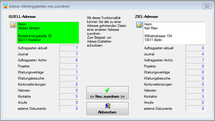 beiden Adressen bereits Aufträge, Projekte oder Ähnliches angelegt sind.