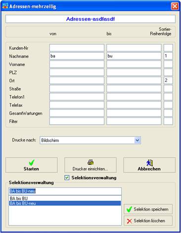 Mit der Adressliste haben Sie die Möglichkeit, einen Adressreport ausdrucken zu lassen, eingegrenzt nach Feldkriterien und Priorität der Felder.