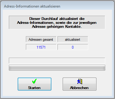 Durch diesen Menüpunkt werden sämtliche Informationen in den Adress-Stammdaten hinsichtlich der nicht immer korrekten Werte der Aufträge, Archivsätze, Zahlungseingangs-Differenzen und sonstigen Zählern aktualisiert. Die Aktualisierung kann je nach Anzahl der vorhandenen Adressen einige Minuten in Anspruch nehmen. Sie können während des Durchlaufs im HLS-90 normal weiterarbeiten. |