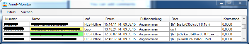 Der HLS-90 Anruf-Monitor (echte Daten wurden geschwärzt)