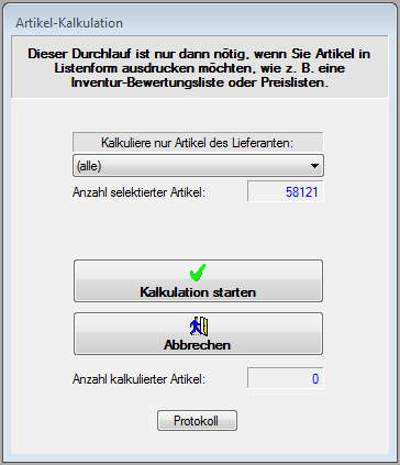 Lieferanten aus. Die Anzahl der kalkulierten Artikel wird mitgezählt.