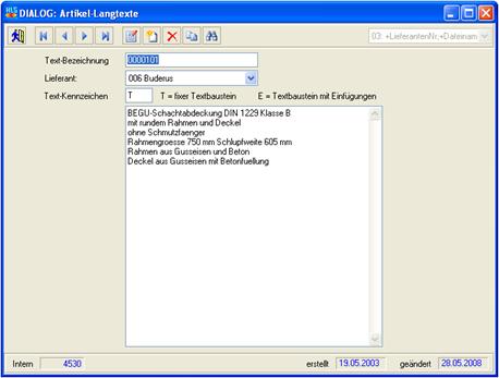 HLS-90 bietet Ihnen mit dieser Funktion die Möglichkeit, alle Langtexte, die Ihnen von den Lieferanten mitgeliefert werden, anzusehen und auch selbst zu bearbeiten. Mit den Kopier- und Einfügefunktionen innerhalb des Hauptmenüpunktes "Bearbeiten" haben Sie so z.B. die Möglichkeit, technische Beschreibungen eines Heizkessels in die Anlagenbeschreibung innerhalb eines Wartungsvertrages zu übernehmen.