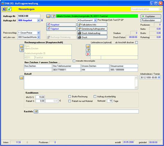 Auftragsnummer laut Auftragsnummernzähler vorgeschlagen. Die
