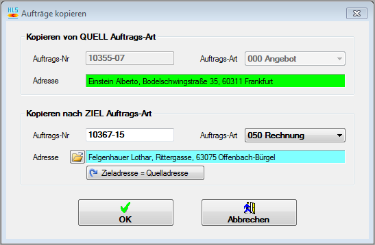 - Kopieren nach ZIEL-Auftragsart: Auftragsnummer: Es wird