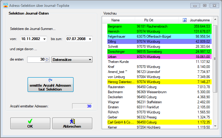 Selektion". Rechts erscheint die Listen mit dem Ergebnis,
