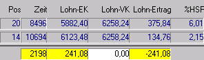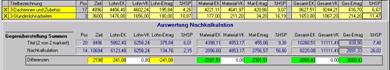 Lohnkostenvergleich: In dem Bild oben sehen Sie, daß wir 2198 Minuten länger auf der Baustelle waren als kalkuliert. Das führt dazu, daß wir für den Lohn-EK 6123,48 Euro bezahlen müssen statt 5882,40 Euro, also 241,08 Euro mehr. Die Erhöhung der Lohnkosten führt dazu, daß Ihr geplanter Lohnertrag von 375,84 Euro nicht erreicht wird. Sie verdienen nur noch 134,76 Euro also 241,08 Euro weniger.