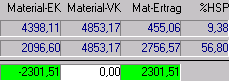 Materialkostenvergleich: Die Materialkosten entwickeln sich erfreulich, da der Einkaufspreis deutlich geringer ausfällt als ursprünglich kalkuliert. Das führt dazu, daß unser Materialertrag um 2301,51 Euro auf 2756,57 Euro steigt.
