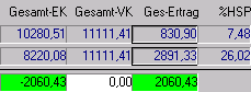 Gesamtkostenvergleich: Man sieht, daß der Ertragsrückgang im Lohnbereich durch den Ertragszuwachs im Materialbereich mehr als ausgeglichen wird. Insgesamt wird der Gewinn 2060,43 Euro höher ausfallen als kalkuliert war.