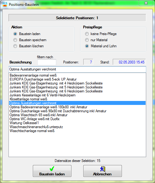 - der Baustein wird in die Positionen übernommen. Die