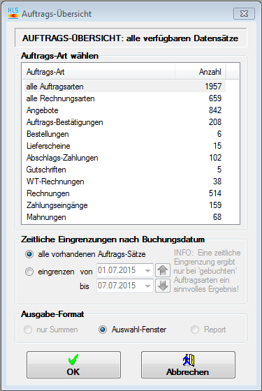 Dieser Dialog bietet Ihnen einen Überblick über alle aktuellen Auftragsarten an.