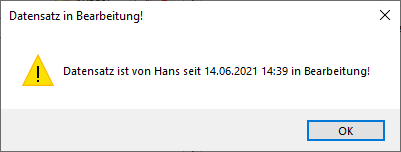 Der entsprechende Datensatz ist daraufhin gesperrt, es erscheint beim erneuten Versuch des Bearbeitens folgende Meldung: