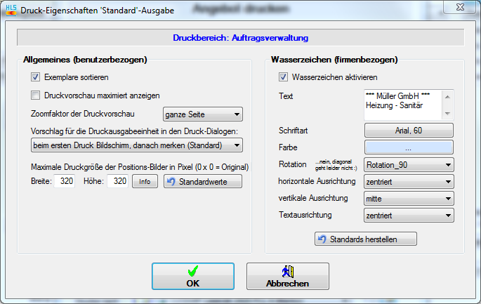 Diese Druck-Eigenschaften können je Druckbereich (hier: Auftragsverwaltung) benutzerbezogen festgelegt werden und vor jedem Druck ggf. an die aktuellen Vorgaben angepasst werden.