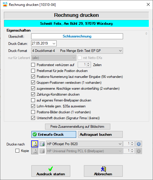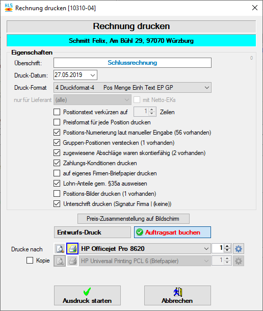 - Entwurfs-Druck / Auftragsart buchen: Wählen Sie hier aus, ob der