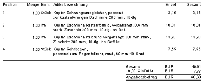 Rundungsfehler: Wenn Sie Rabatt auf einzelne Positionen geben, wird der Rabatt auf Lohn und Material getrennt berechnet und dann die Werte addiert. Dadurch können Unterschiede zwischen dem Einzelpreis und dem Gesamtpreis entstehen.