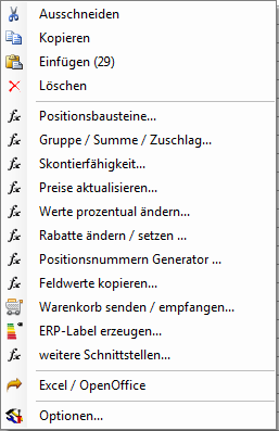 Kontext-Menü der Positionsliste |