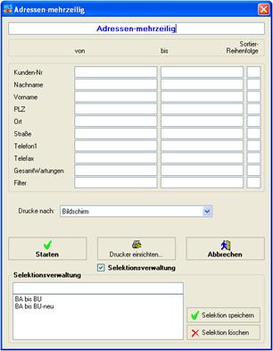 Das Resultat obiger Beispiel-Einstellung führt dann im Menüpunkt Listen -> Adressen -> Adressen mehrzeilig zu einem Selektionsfenster mit folgendem Aussehen: