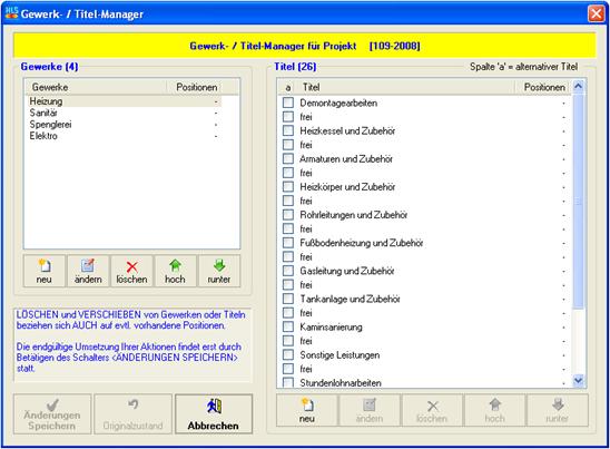 Klicken Sie den Schalter „Gewerk- / Titelmanager“. Es werden Ihnen bei jedem neuen Projekt die Standardvorbelegungen für die Gewerke und Titel der Projekte angeboten, die Sie in den Dienstprogrammen -> Vorbelegungen -> Gewerk- und Titelbezeichnungen hinterlegt haben.