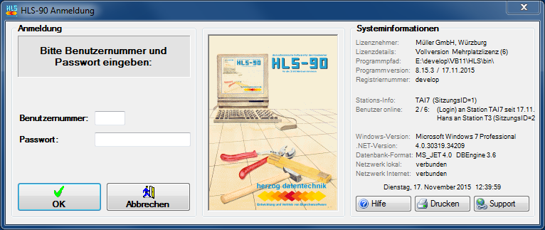 Während des Ladens dieses Dialogs werden aktuelle Daten zu Ihrem PC, Ihrer HLS-90 Version und Ihrer Sitzung ermittelt und im Bereich Systeminformationen angezeigt.