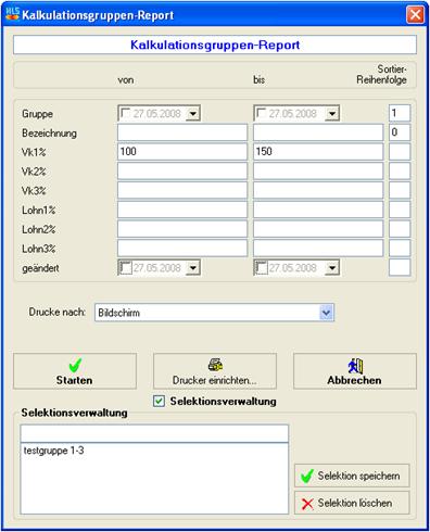 Drucken Sie eine Liste Ihrer Kalkulationsgruppen aus. Sie haben folgende Eingrenzungsmöglichkeiten: