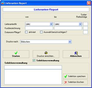 Drucken Sie eine Liste Ihrer Lieferanten aus. Sie haben folgende Eingrenzungsmöglichkeiten: