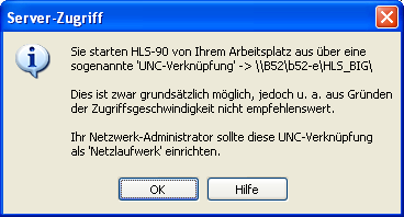 Beschreibung: Beim Starten von HLS-90 bekommen Sie die Meldung, daß Sie HLS-90 über eine sog. „UNC-Verknüpfung“ starten, wie z. B. „\\RechnerName\Laufwerk\Verzeichnis“. Verbindungen dieser Art zum Server sind zwar möglich, aber mit etlichen Nachteilen verbunden, z. B. erhebliche Performance Probleme beim Zugreifen auf Serverdaten.