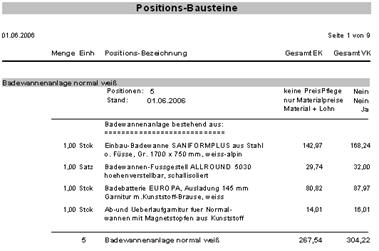 Unter diesem Menüpunkt können Sie sich alle Bausteine, die innerhalb der Auftrags- oder Projektverwaltung unter Funktionen -> Bausteine abgespeichert wurden, mit allen dazugehörigen Positionen ausdrucken lassen.