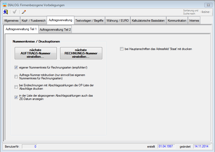 Register: Auftragsverwaltung Teil 1 / Nummernkreise
