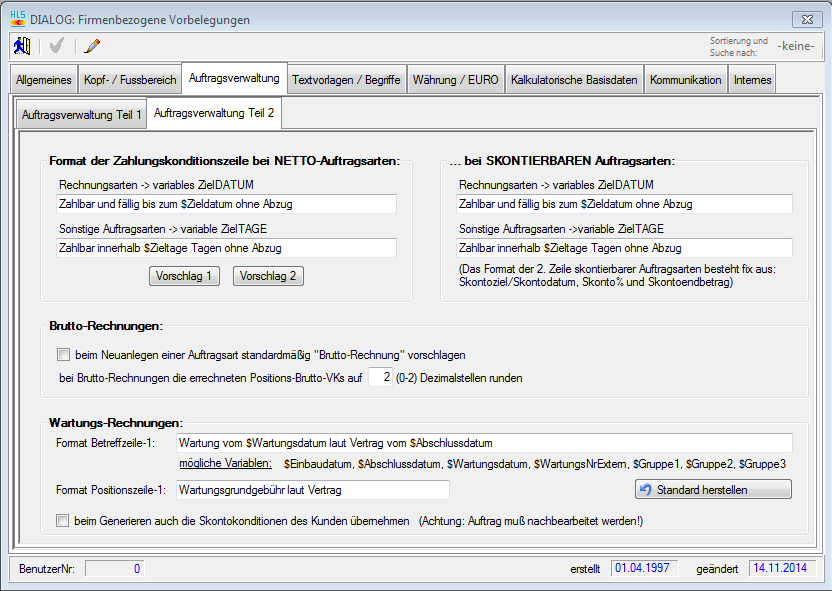 Hier können Sie einstellen, was in den Zahlungsbedingungen stehen soll. Es wird unterschieden zwischen der konkreten Datumsangabe für die Rechnungsarten und einer Angabe der Zieltage für alle anderen Auftragsarten. Über die Schalter "Vorschlag 1" und "Vorschlag 2" können Sie Standardformulierungen aufrufen. Die Variablen "$Zieldatum" und "$Zieltage" werden beim Ausdruck durch das Datum oder die Zieltage ersetzt.