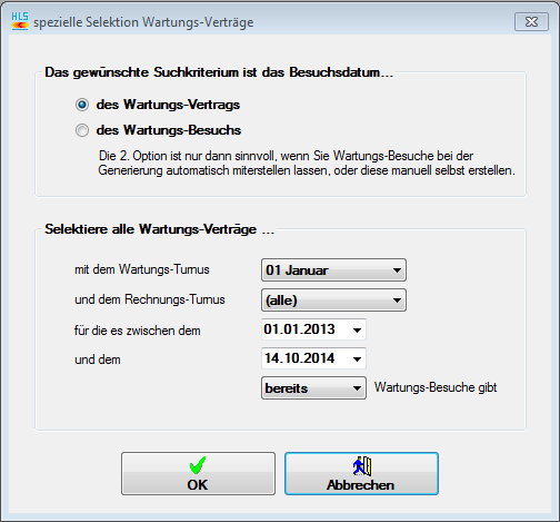 Diese Funktionalität dient dem Selektieren von Wartungsverträgen über das Besuchsdatum des Wartungsvertrags oder des Wartungsbesuchs.