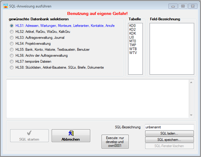 Falls Sie von herzog datentechnik SQL-Anweisungen bekommen haben, so können Sie diese in der Maske unter einer beliebigen Bezeichnung abspeichern. Dafür geben Sie im Feld "SQL-Bezeichnung" einen Namen für die SQL-Funktion ein, klicken anschließend auf "SQL speichern" und wählen dann einen freien Speicherplatz aus. |