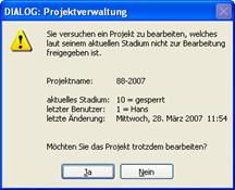 Wenn Sie ein gesperrtes Projekt zur Bearbeitung öffnen, bekommen Sie folgende Mitteilung: