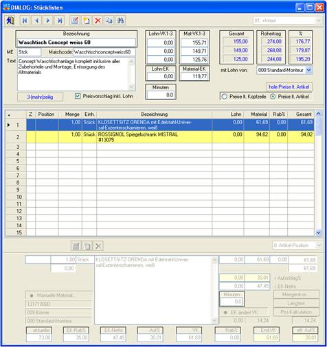 der Stückliste mit Lohnminuten und den dazugehörigen Lohnverkaufspreisen