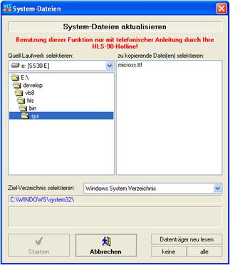 Die Windows-Betriebssysteme kosten (bei allen Vorteilen) viel Nerven: oft genug werden bei der Installation von neuer Software so genannte System-Dateien von HLS-90 (.DLL, .OCX, etc.) überschrieben, was zum Ausfall bestimmter Funktionen (meistens in Bezug auf die Druckausgabe) führen kann. Durch diesen Menüpunkt können die wichtigsten Dateien wieder auf HLS-90-Stand aktualisiert werden.