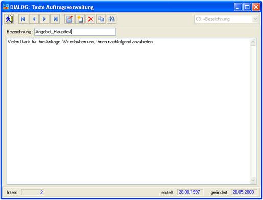 Legen Sie hier standardisierte Haupt- und Folgetexte für alle Auftragsarten an, z.B. Angebotshaupt- und Folgetext, Auftragsbestätigungshaupt- und Folgetext, Rechnungshaupt- und Folgetext. Weiterhin sind hier Standardtexte für die Vorbemerkungen, Nachbemerkungen und Anschreiben innerhalb der Projektverwaltung zu hinterlegen.