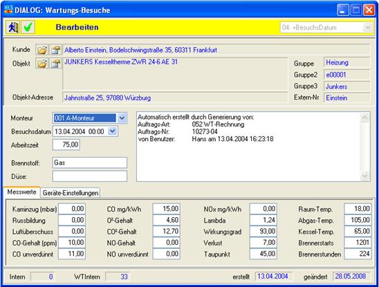 Die Neuanlage, Bearbeitung und Löschung von Wartungsbesuchen erfolgt analog der Adressverwaltung, so daß im Folgenden nur die Neuanlage mit den Feldinhalten behandelt wird.