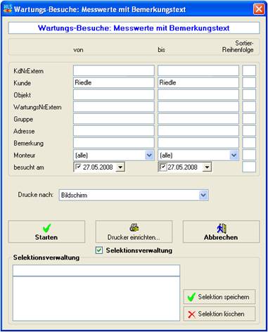 Drucken einer Liste aller Wartungsbesuche beim Kunden Riedle, durchgeführt von allen Monteuren im Zeitraum 27.01.2005 bis 31.03.2007: