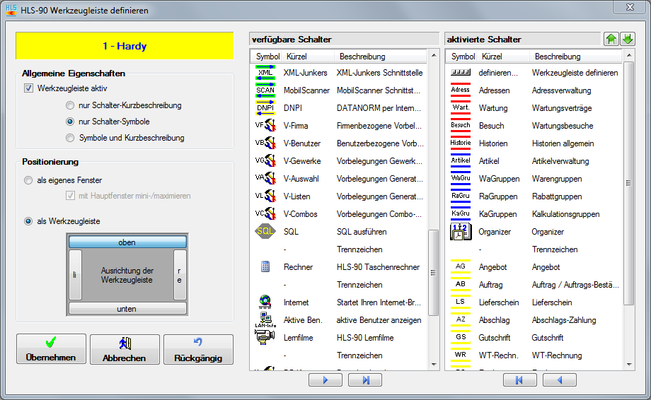 Hier können Sie das Aussehen und die Ausrichtung der Werkzeugleiste einstellen. Auf der rechten Seite legen Sie fest, welche Schalter in der Leiste erscheinen. Entfernen Sie selten benutzte Funktionen durch einen Doppelklick oder die Pfeiltasten um die Werkzeugleiste möglichst klein zu halten.
