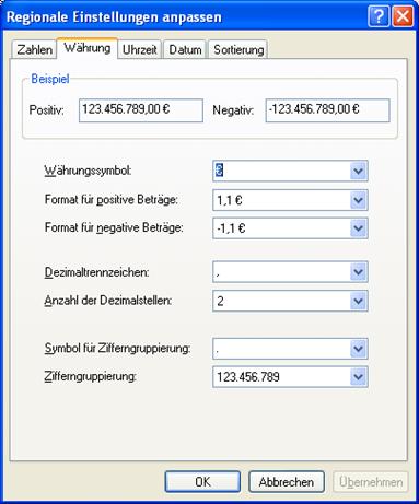 Ländereinstellungen / Register Währung